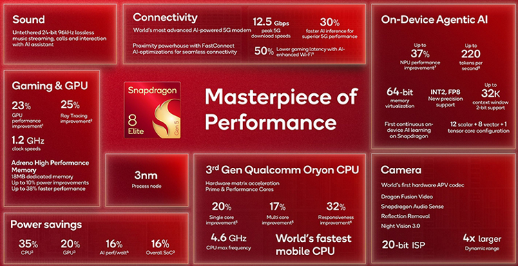 Gravé en 3 nm par TSMC, le Snapdragon 8 Elite Gen 5 sera intégré dans la quasi-totalité des smartphones Android premium de 2025 et 2026. Qualcomm cite parmi ses partenaires : Honor, iQOO, Nubia, OnePlus, OPPO, POCO, Realme, Redmi, RedMagic, Asus ROG, Samsung, Sony, Vivo, Xiaomi et ZTE.