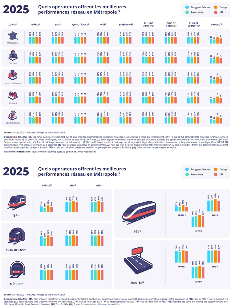 L’Arcep vient de publier sa campagne 2025 de mesures de la qualité des services mobiles, un baromètre scruté chaque année avec attention par les opérateurs comme par les consommateurs. Réalisée entre juin et août, cette nouvelle édition s’appuie sur plus d’un million de mesures en conditions réelles, partout en France et dans tous les modes de transport.