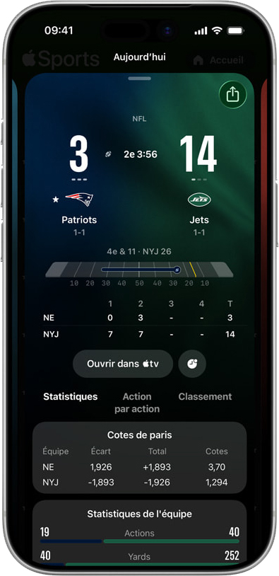 - Disponible dès maintenant sur l’App Store (nécessite iOS 17.2 au minimum), Apple Sports se distingue par son interface claire, rapide et intuitive, fidèle à l’identité graphique de la marque. L’objectif est simple : offrir aux fans une vue complète et instantanée de l’actualité sportive.