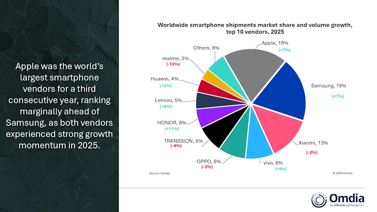 Cette performance est largement tirée par un quatrième trimestre record. Omdia met particulièrement en avant la dynamique en Chine continentale, où Apple affiche une croissance spectaculaire de 26 % au T4, soutenue par la demande autour de la gamme iPhone 17. Un résultat d’autant plus notable qu’il intervient dans un marché chinois globalement en léger repli sur l’année.