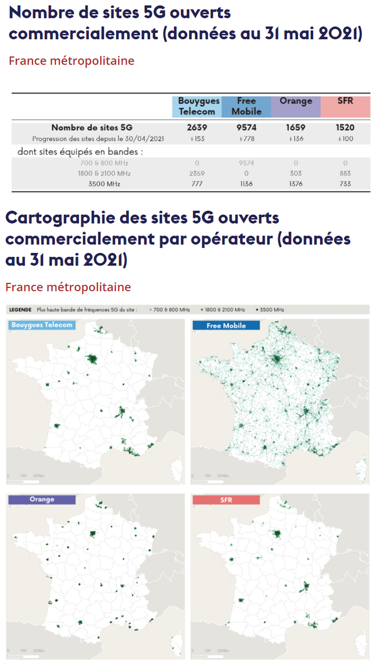 Au 31 mai 2021, le nombre de site 5G était de 2 639 pour Bouygues Telecom, 9 574 chez Free, 1 659 pour Orange et 1 520 pour l'opérateur SFR.