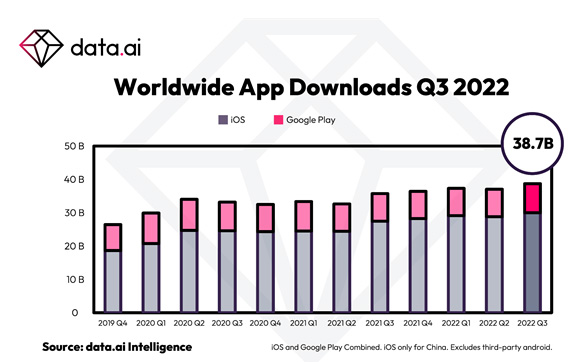 Le dernier indice trimestriel de l'industrie des applications de data.ai révèle que le troisième trimestre 2022 a été le trimestre le plus important à ce jour pour les téléchargements. Avec 38,7 milliards de téléchargements de nouvelles applications et de jeux, il a augmenté de 8 % par rapport au troisième trimestre 2021.