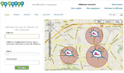 AdMoove permet aussi de définir des zones de diffusion adaptées aux besoins de chaque annonceur : il est ainsi possible de diffuser une campagne dans un cercle de 500 mètres de rayon autour d'une boutique, de cibler une ville ou un code postal. Il est également possible de fixer les jours et les heures de diffusion des campagnes pour les faire coïncider avec les horaires d'ouverture des points de vente.