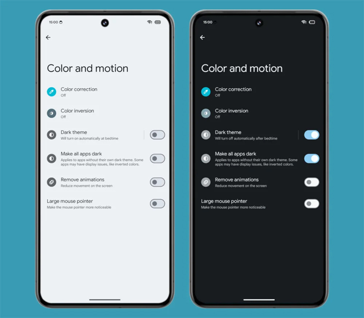 Contrairement à l'option "Forcer le mode sombre" d'Android 14, qui ne fonctionne que sur les applications compatibles, cette nouvelle fonctionnalité permet d'appliquer un thème sombre sur toutes les applications qui ne le permettent pas.