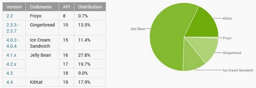 Du côté de Jelly Bean, même si elle reste l'édition la plus utilisée de l'OS de Google avec 56,5 % des terminaux, il faut aussi prendre en considération les différentes versions. C'est une chute globale de 1,9 % pour cette édition. Jelly Bean 4.1 demeure la plus répandue avec 27.8 % alors que les versions 4.2 et 4.3 représentent respectivement 19.7 et 9 pour cent.