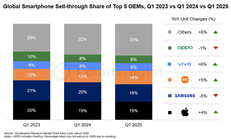 Derrière ce duel de titans, les constructeurs chinois confirment leur montée en puissance. Xiaomi conserve sa troisième place mondiale avec 14 % de parts de marché et une croissance annuelle de +5 %.