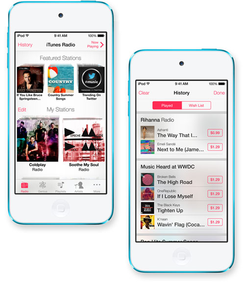 Disponible cet automne, iTunes Radio permet d'écouter une chanson sur iTunes Radio ou extraite de la bibliothèque musicale, l'utilisateur peut ainsi créer une station basée sur ce morceau. Il peut aussi créer et personnaliser des stations en fonction de ce qu'il écoute. Recherchez des artistes, des morceaux ou des genres musicaux et iTunes Radio créera instantanément une station correspondant à son choix.