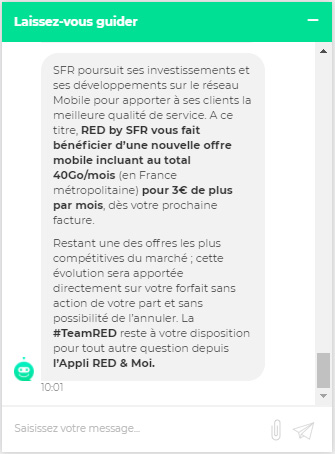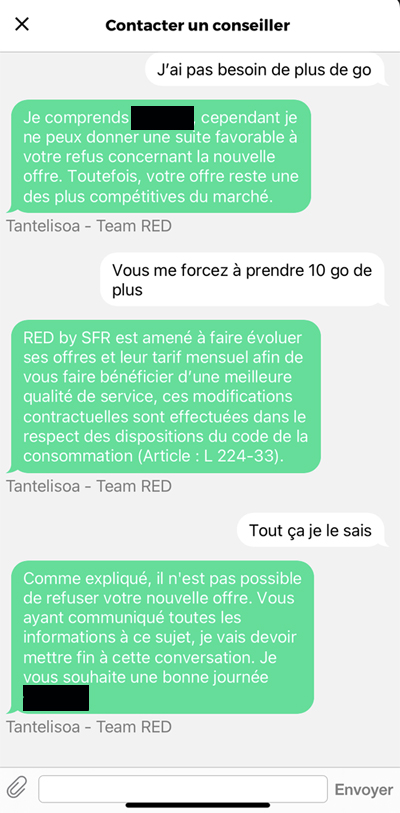 Cette augmentation de prix de RED by SFR est impossible à refuser. Lorsqu'un abonné contacte le service client RED by SFR pour s'opposer à cette augmentation arbitraire, le service clients répète les mêmes informations écrites sur le mail envoyé par l'opérateur ou le texte du robot via le chat comme l'atteste nos captures d'écran. Si l'abonné insiste un peu pour trouver une solution avec le conseiller, celui-ci coupe automatiquement la conversation ne laissant aucune possibilité à l'abonné de lui répondre.