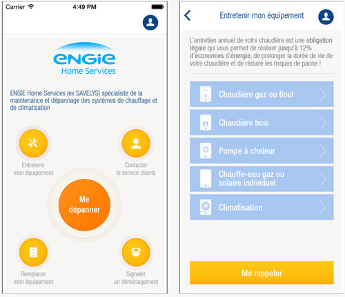 Crédit Photo : iTunesENGIE Home Services, propose à l’ensemble de ses clients une application mobile en complément de leur espace client en ligne. Grâce à cette application, les particuliers pourront désormais être en contact instantanément avec ENGIE Home Services et obtenir des conseils adaptés sur l’utilisation de leurs différents équipements.