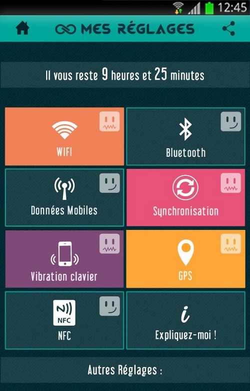 L'application ne s'arrête pas là puisqu'elle offre plus de visibilité sur la consommation de chaque paramètre. Un « smiley » donne une indication sur la consommation d'énergie de chaque paramètre, comme la WiFi ou la luminosité de l'écran. De plus, des graphiques permettent de suivre l'évolution de l'autonomie de la batterie. De plus, il est possible de préparer des profils qui adaptent les paramètres en fonction des besoins et des situations, que l'on soit à la maison, en voiture ou au bureau par exemple.