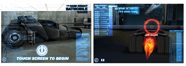 - Au volant des 2,5 tonnes de la Batmobile, le joueur doit aider Batman à parcourir les rues de Gotham City le plus rapidement possible, en passant avec succès ses séries de tremplins géants. Le jeu vous invite à courir après le meilleur score et vous permet de faire bondir la Batmobile dans les airs sur plusieurs dizaines de mètres. The Dark Knight : Batmobile utilise l'accéléromètre et des graphismes 3D.