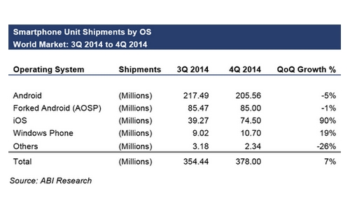 De son côté, Windows Phone ne jouit pas d'une place dorée, mais a toutefois connu une progression de 19 % pendant les deux derniers trimestres de 2014. Le système d'exploitation de Microsoft est passé de 9,02 millions à 10,70 millions de terminaux entre le troisième et quatrième trimestre.