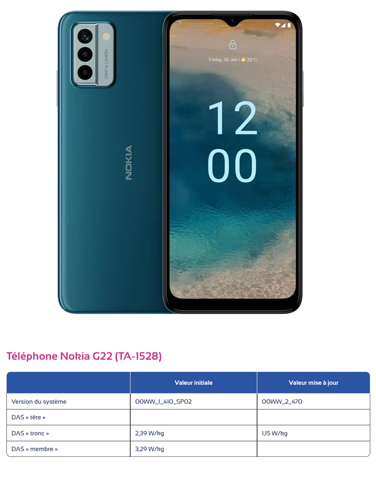 L'ANFR a imposé une mise à jour logicielle sur le téléphone Nokia G22 pour cause de non-conformité au DAS. L'Agence nationale des fréquences a récemment découvert que le téléphone dépassait la limite réglementaire d'exposition aux ondes. L'ANFR a contraint la société HMD à prendre des mesures correctives pour remédier à la situation.