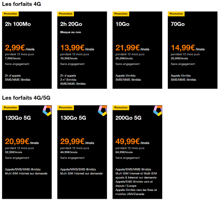 D'ailleurs, Orange devient intéressant pour ceux qui recherchent un forfait 5G pas cher sur son réseau avec une enveloppe Web de 120Go pour 20,99€ par mois la première année puis 32.99€ par mois. Les forfaits premium 130Go et 200Go sur le réseau 4G et 5G sont également disponibles avec engagement de 24 mois au même prix mais avec la possibilité de profiter d'un tarif avantageux lors de l'achat d'un nouveau smartphone.