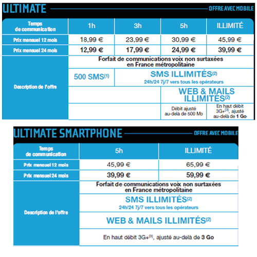 Depuis le 1er mars, NRJ Mobile a lancé une nouvelle gamme Ultimate avec mobile ou smartphone subventionné. L'offre comprend une gamme de forfaits à partir de 1 heure d'appels jusqu'aux forfaits illimités avec appels, SMS en illimité et du web en haut débit 3G+ jusqu'à 3Go.