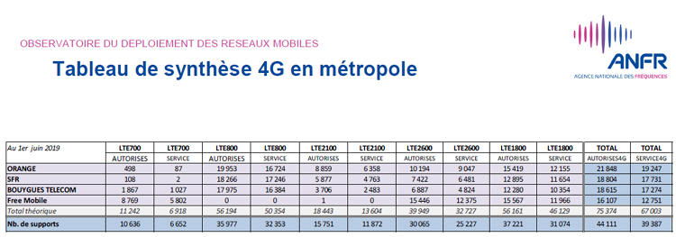 Selon les données publiées par l'Agence nationale des fréquences (ANFR), au 1er juin 2019, 46 585 sites ont été autorisés par l'ANFR, dont 41 637 sont en service, pour la téléphonie mobile très haut débit (4G) tous opérateurs confondus. Les demandes d'autorisations des sites 4G se sont accrues de 0.8 % et les mises en service de sites 4G ont augmenté de 0.5 %.