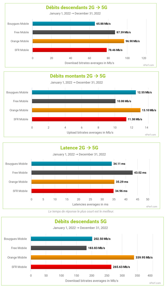 En 2022, les performances réseau des opérateurs ont encore bénéficié de la 5G. Toutefois, l'impact de cette nouvelle norme de téléphonie s'est atténué sur le deuxième semestre de l'année. Orange est toujours n°1 et impressionne sur ses débits descendants 5G.