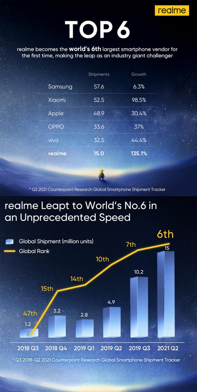 La nouvelle marque chinoise Realme, qui veut se faire une place sur le marché des smartphones, vient de se positionner parmi le top 6 des fournisseurs de smartphones au niveau mondial au deuxième trimestre 2021 selon les données de la société d'analyse industrielle Counterpoint. Realme s'est hissée dans le top 6 en seulement trois ans, ce qui constitue un exploit pour une marque de smartphones qui n'était au départ qu'un petit fabricant de smartphones basé à Shenzhen.