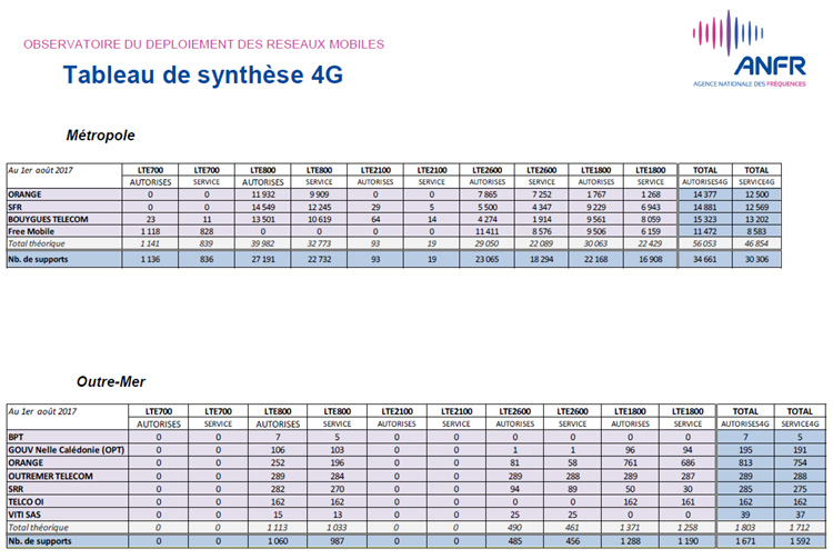 Selon les données publiées par l'Agence nationale des fréquences (ANFR), au 1er août 2017, 36 332 sites ont été autorisés, dont 31 898 en service, pour la téléphonie mobile très haut débit (4G) tous opérateurs confondus. Les autorisations de sites 4G accordées au cours du mois de juillet progressent faiblement (1% contre 2,2 % au mois de juin). Les demandes d'autorisation des sites 4G sont en baisse de 1.3 % (3.4 % en juillet).