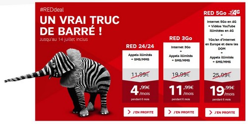 Cependant, il faut noter que le forfait Red 2H + SMS illimités n'est pas concerné et reste donc facturé à 4,99 €. Si les quatre offres proposent les SMS et MMS en illimités, seul le forfait Red 5 Go propose la 4G. De plus, Red 5 Go inclue les vidéos YouTube en illimité à travers la 4G.