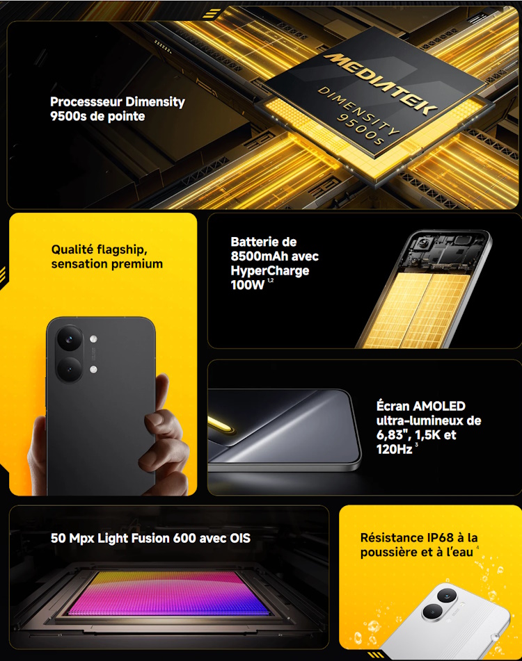 Sous le capot, le smartphone embarque la puce Dimensity 9500s, gravée en 3 nm, qui lui permet d’atteindre des sommets en matière de performances. Le constructeur évoque un score dépassant les 3 millions de points sur AnTuTu, un niveau rarement observé sur ce segment de prix. Associé à de la mémoire LPDDR5X et du stockage UFS 4.1, l’ensemble promet une bonne fluidité, aussi bien en usage quotidien qu’en jeu intensif.