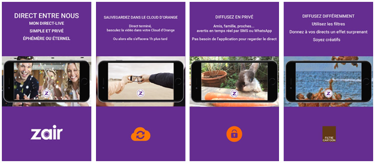 Zair by Plussh est une application de direct vidéo pour les abonnés Orange. Elle permet de partager des vidéos en direct et de conserver ses replays dans le Cloud d'Orange.